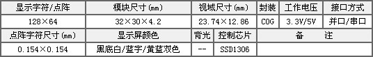 - 描述:顯示點陣:128X64,品牌:金鵬 ,模塊尺寸:32X30X4.2 視域尺寸:23.74X12.86 控制IC:SSD1306 封裝COG 串口/并口,工作電壓3.3V(2.7-3.5),工作溫度-40至70