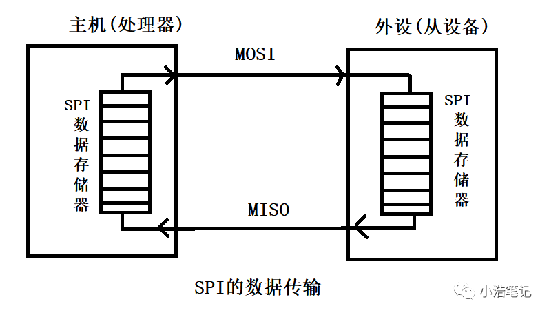 主機(jī)和外設(shè)都包含一個(gè)串行移位寄存器,主機(jī)通過(guò)它的SPI串行寄存器寫(xiě)入一個(gè)字節(jié)來(lái)發(fā)起一次傳輸。寄存器是通過(guò)MOSI信號(hào)線將字節(jié)傳送給外設(shè),外設(shè)也將自己的移位寄存器中的內(nèi)容通過(guò)MISO信號(hào)線返回給主機(jī)。這樣,兩個(gè)移位寄存器中的內(nèi)容就被交換了。外設(shè)的寫(xiě)操作和讀操作是同步完成的,因此SPI成為一個(gè)很有效的協(xié)議。